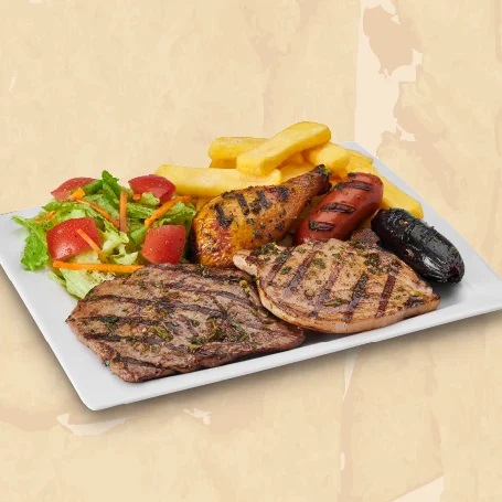 Parrillada ideal para 1 persona, contiene 1 presa de pollo, 1 filete de lomo, 1 chuletas, 1 chorizo y 1 morcilla, todo hecho a la parrilla con nuestro chimichurri  y acompañado por papas fritas y ensalada fresca.